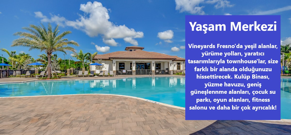 Akdeniz kasaba evlerinin  çekiciliği ve zarafetinden ilham alan Vineyards Fresno, yeni 2 katlı geniş mekanlardan oluşan koleksiyonuyla lüks resort tarzındaki yaşama kapılarını açıyor. Dışı taş kaplı tasarımı, garajı, açık mutfak ve yaşam alanları  ve geniş master süitleri ile dört benzersiz townhome tasarımı ile yeni bir yaşam tarzı. Bu aile odaklı sitenin  merkezinde, güneşlenme alanı, çocuk su parkı, oyun alanı, tot-lot, son teknoloji ürünü fitness merkezi, köpüklü yüzme havuzu, kulüp binası’nın keyfini çıkarabilirsiniz. Rekreasyon yolları, nefes kesici göl manzarası ve açık hava eğlenceleri için mükemmel geniş yeşil alanlar.